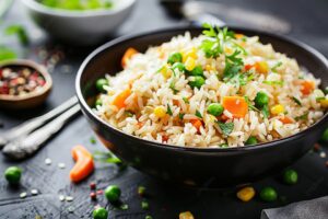 Cook rice ahead of time and store it in the refrigerator. When you’re ready to cook, sauté garlic, carrots, peas, and onions in a pan. Add the rice, soy sauce, and a scrambled egg for extra protein.