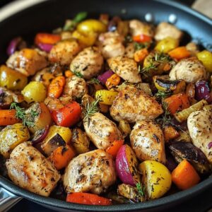 Cook small chicken pieces in a pan with olive oil, salt, and pepper. Add vegetables such as bell peppers, zucchini, or carrots.