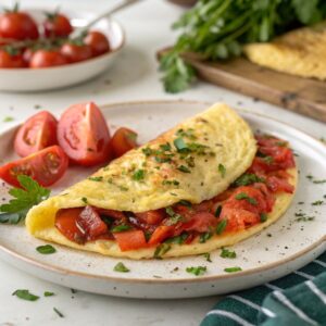 Beat two eggs in a bowl, add chopped tomatoes, onions, and a pinch of salt. Cook the mixture in a small pan until it sets.