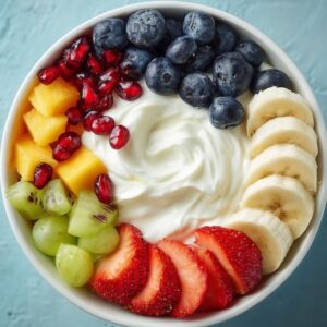 Add yogurt to a bowl and top it with fruits like bananas, apples, or berries. Sprinkle granola or nuts for extra texture.